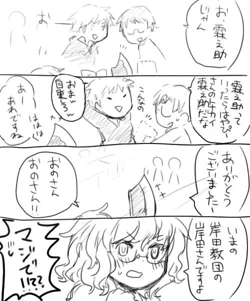 >博多と絵茶お疲れ様でしたー! 博多ではヘタレて挨拶できなかったのにマイピク申請させてもらって何か色々申し訳ないですorz 絵茶も田んぼ手伝いのせいで何も出来なくてうごああああああorz でもかわいい霖之助が見られたのでちょっと幸せでしたw また機会がありましたら是非そのときは絵茶をば!! RL